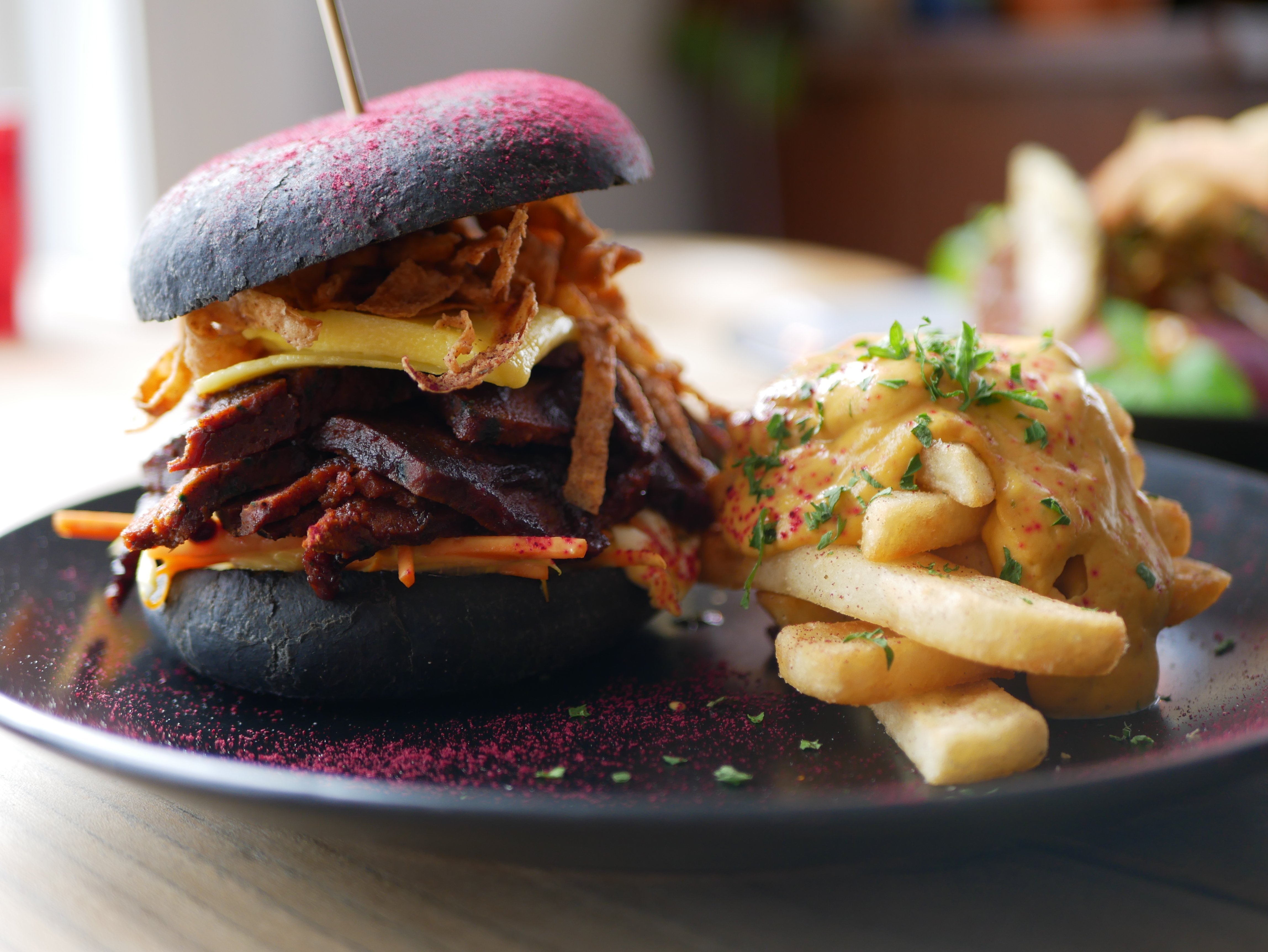 Sticky barbeque seitan brisket with melted vegan cheese, pickles, carrot slaw and American mustard in a blueberry bun, with crispy potatoes and cheese sauce. Matched with Garage Project Golden Path - Juicy Session Hazy IPA.