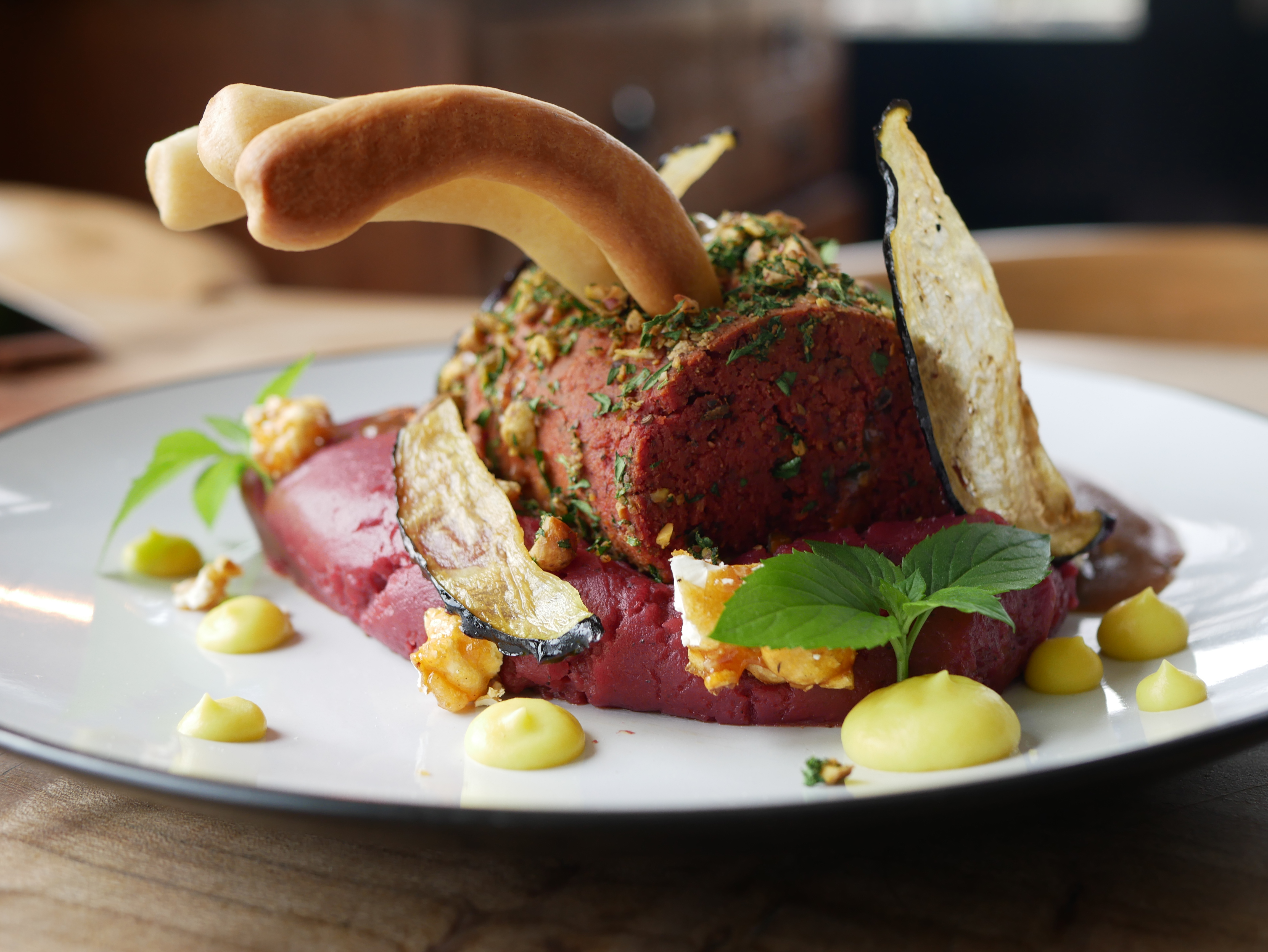 Vegan lamb rack with purple creamed potato, aubergine crisps, Kāpiti-grown carrot puree, rosemary popcorn, jus and chocolate mint.